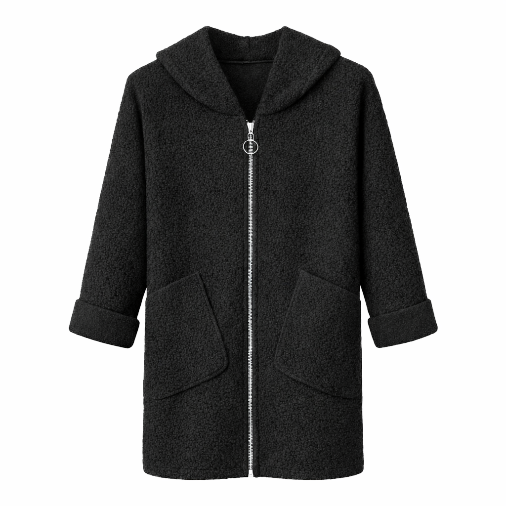 Abrigo largo de tejido tipo borreguito, suave y cálido, con capucha integrada y cierre frontal de cremallera.