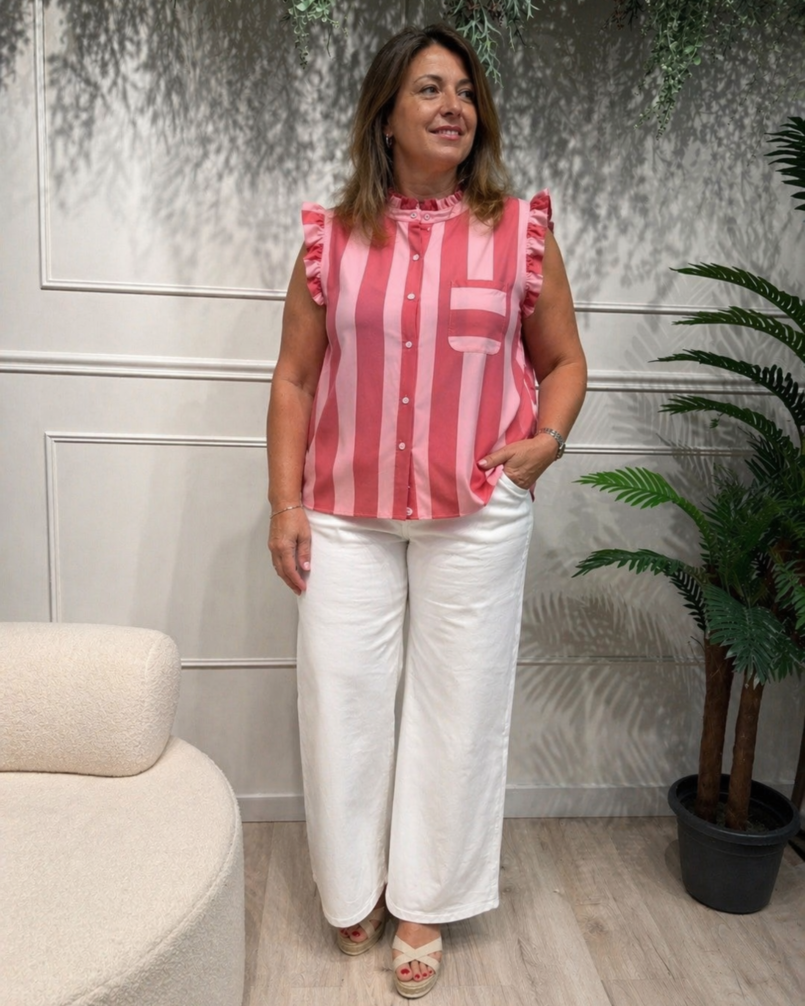 Blusas sin mangas de estilo fresco, con rayas verticales en tonos azul y rosa. Diseño con cuello fruncido, botones frontales y bolsillo decorativo. Tejido ligero y cómodo, ideal para looks casuales y elegantes en cualquier temporada. 🌸