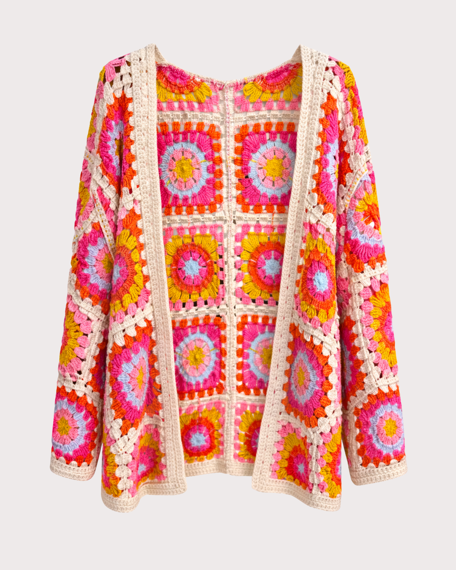 Cárdigan de croché con diseño artesanal de cuadros geométricos multicolor y acabado en tono crudo. Ligero, llamativo y con un estilo boho muy actual. ✨