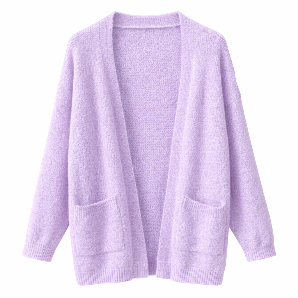 Este cárdigan lila claro destaca por su tejido suave y gustoso, ideal para aportar calidez sin renunciar a la ligereza 💜. Su diseño abierto lo convierte en una prenda cómoda y muy fácil de combinar.