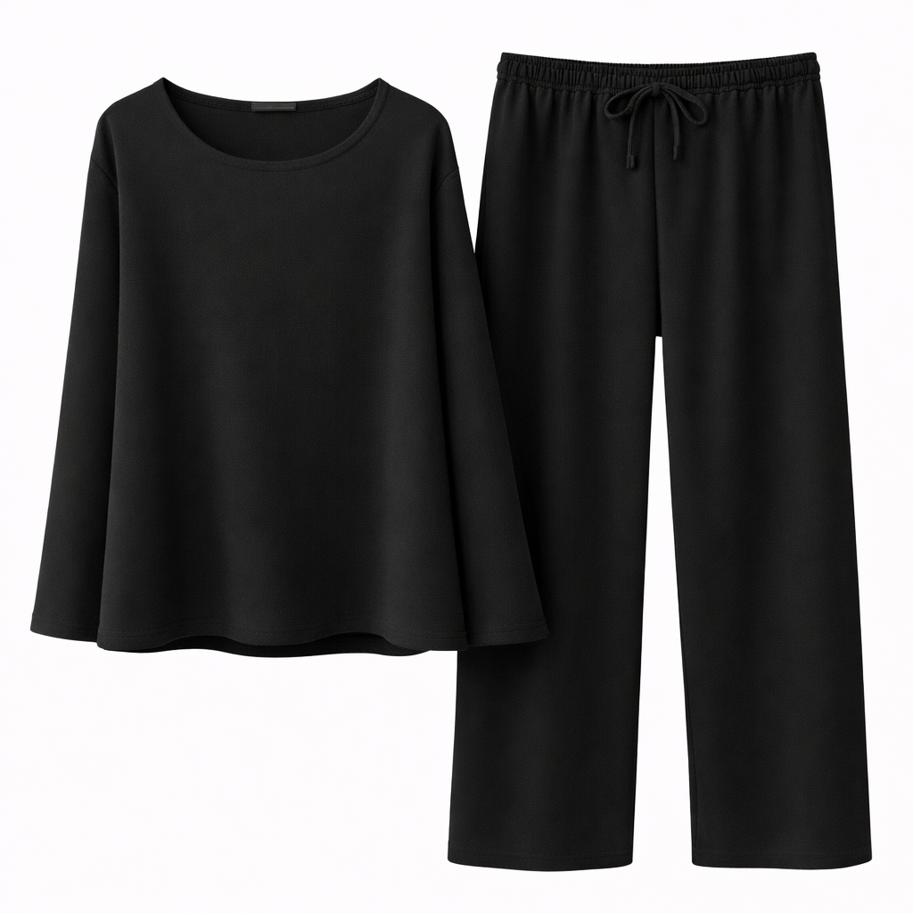 Conjunto de dos piezas en tejido suave y fluido, sudadera de cuello redondo y pantalón de pierna recta con cintura elástica. Perfecto para looks relajados sin renunciar al estilo.🎀