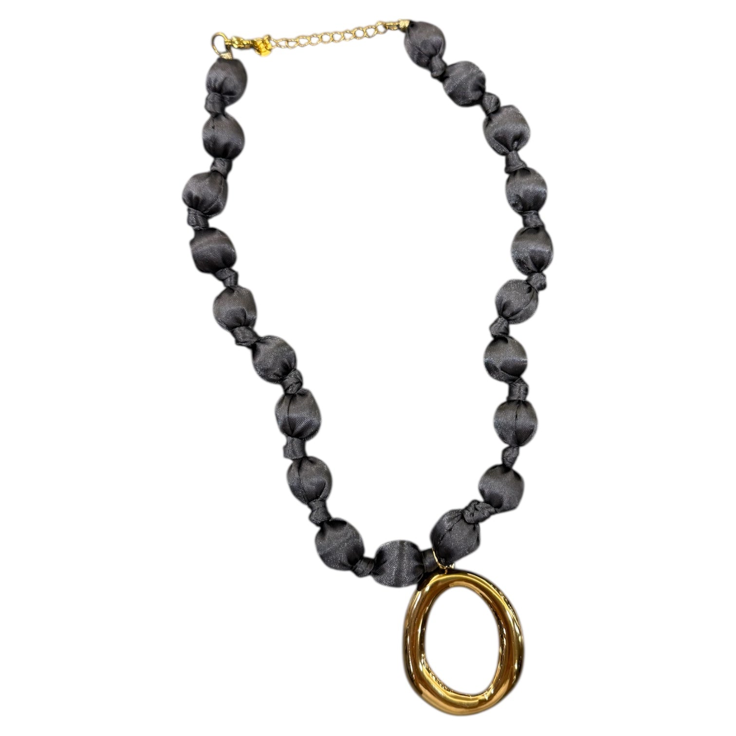El Collar Bolas Corto es el complemento ideal para elevar cualquier look con un toque de elegancia moderna. Su diseño combina bolas forradas en tela satinada color marrón con un colgante dorado central de forma orgánica que aporta sofisticación y originalidad.