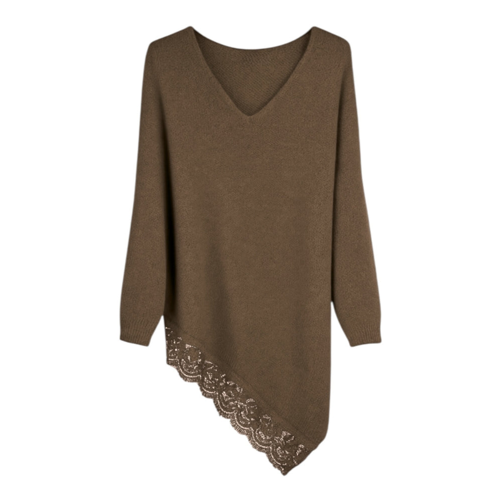 Este jersey asimétrico en tono burdeos es ese toque elegante y favorecedor que todas necesitamos en el armario. Su caída estiliza muchísimo y el detalle de encaje en el bajo le da un acabado femenino, delicado y súper especial.