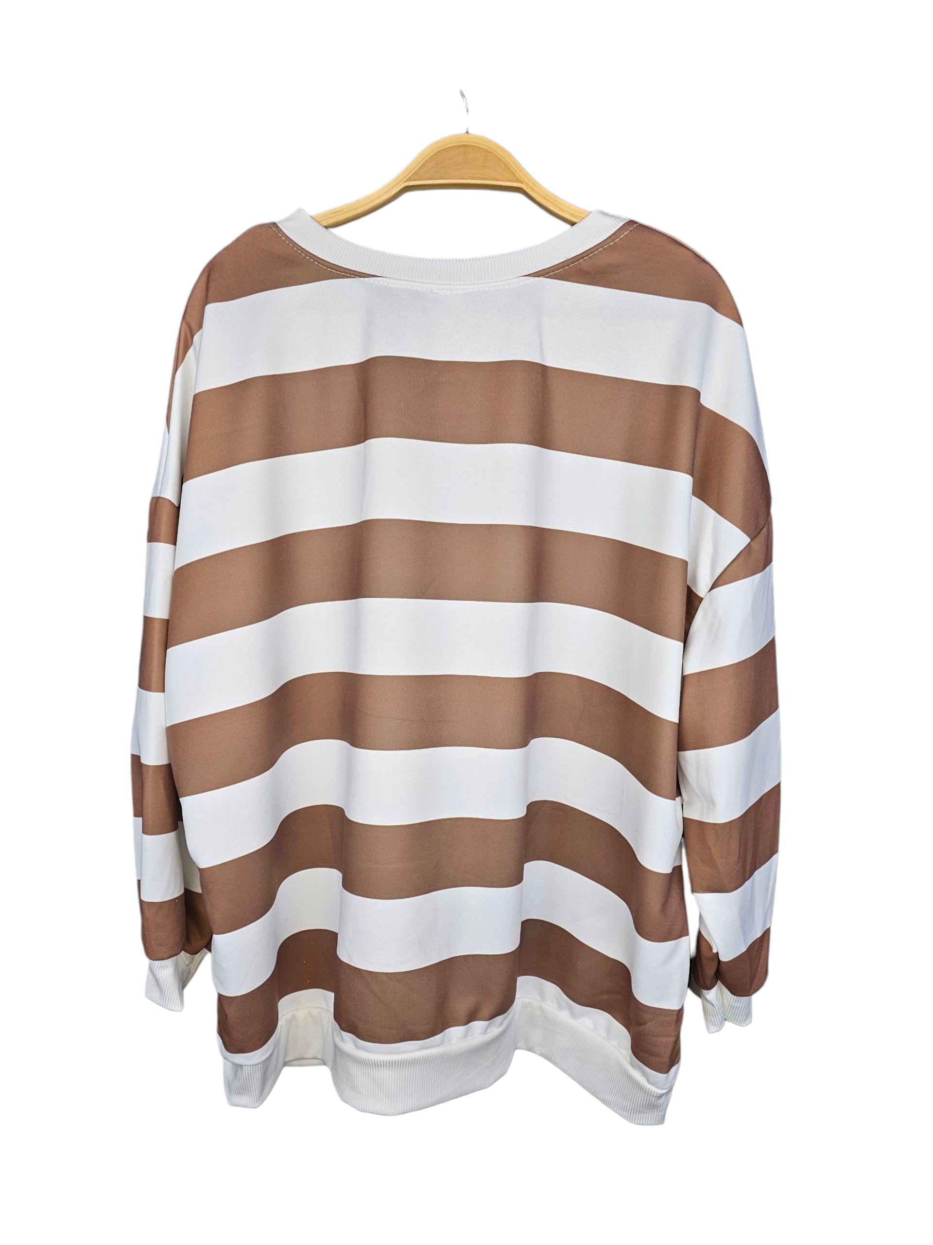 Inspiración universitaria con el toque comfy que amamos 🏈✨. El jersey Boston combina un diseño de rayas anchas en marrón y blanco con un estampado estilo college “Boston University 68”, perfecto para darle un aire juvenil y moderno a tus outfits.
