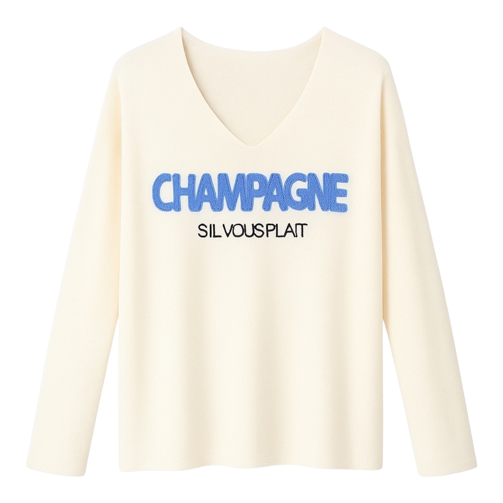 El Jersey Champagne combina comodidad y estilo con un toque chic francés. Confeccionado en un tejido suave y brillante, destaca por su escote en pico favorecedor y el bordado frontal en tonos azul celeste que aporta un aire desenfadado.