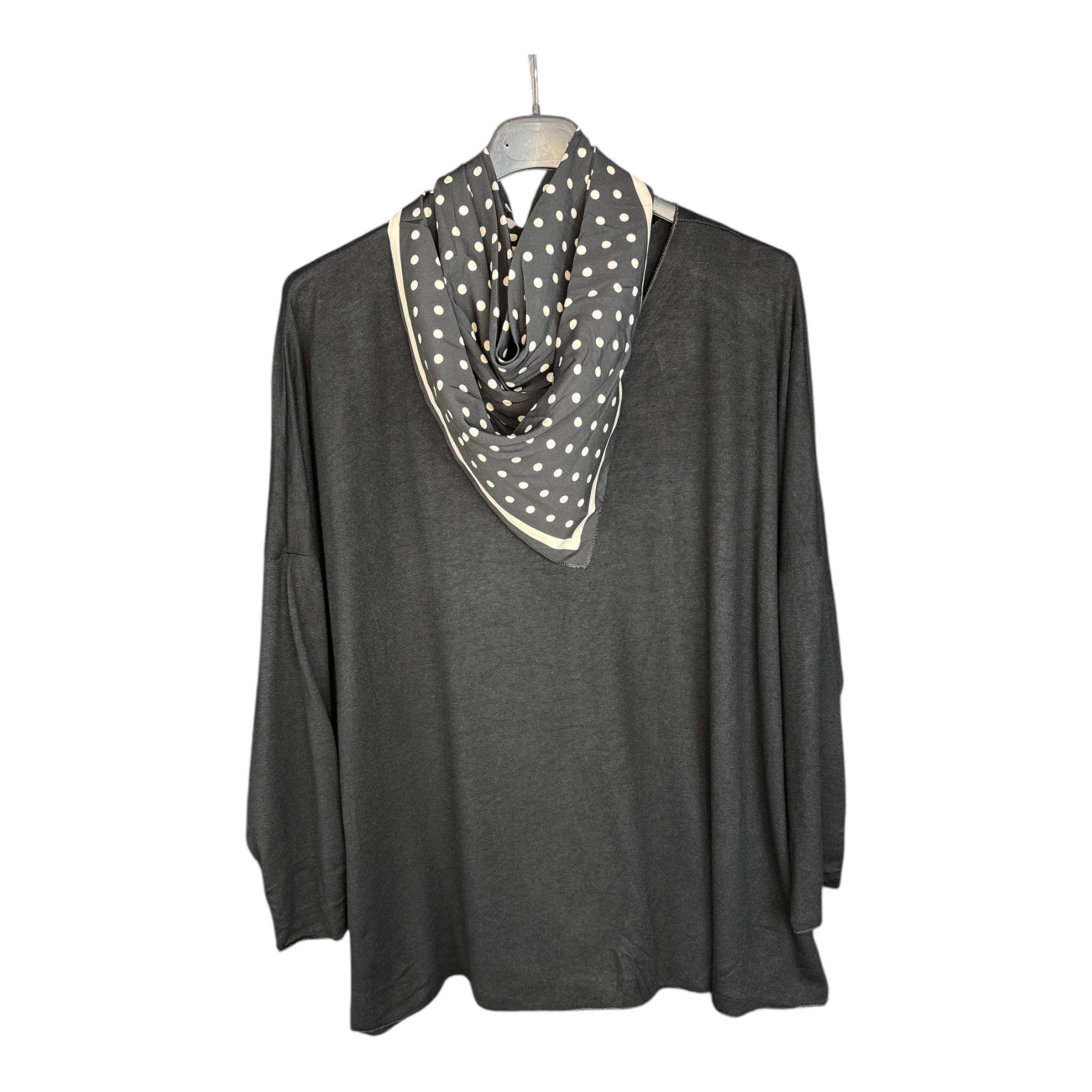 Un básico con un plus de estilo 🧣. Jersey suave y cómodo, acompañado de un pañuelo de topos en el mismo tono para completar el look con un toque chic. Ideal para darle un aire elegante y diferente a tus outfits de cada día 💕.