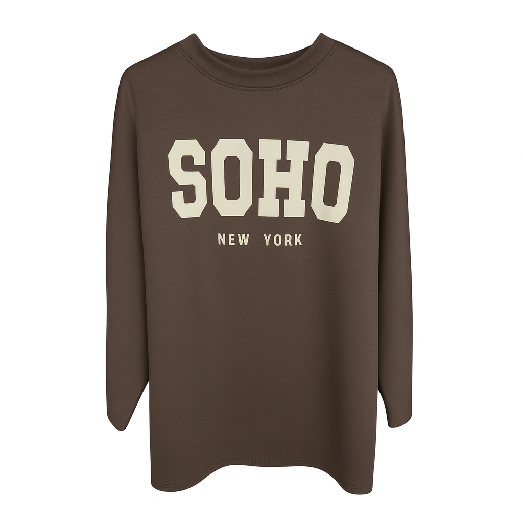 El estampado frontal “SOHO New York” le da un aire moderno y juvenil, fácil de combinar con jeans, leggins o faldas para un look casual con personalidad.