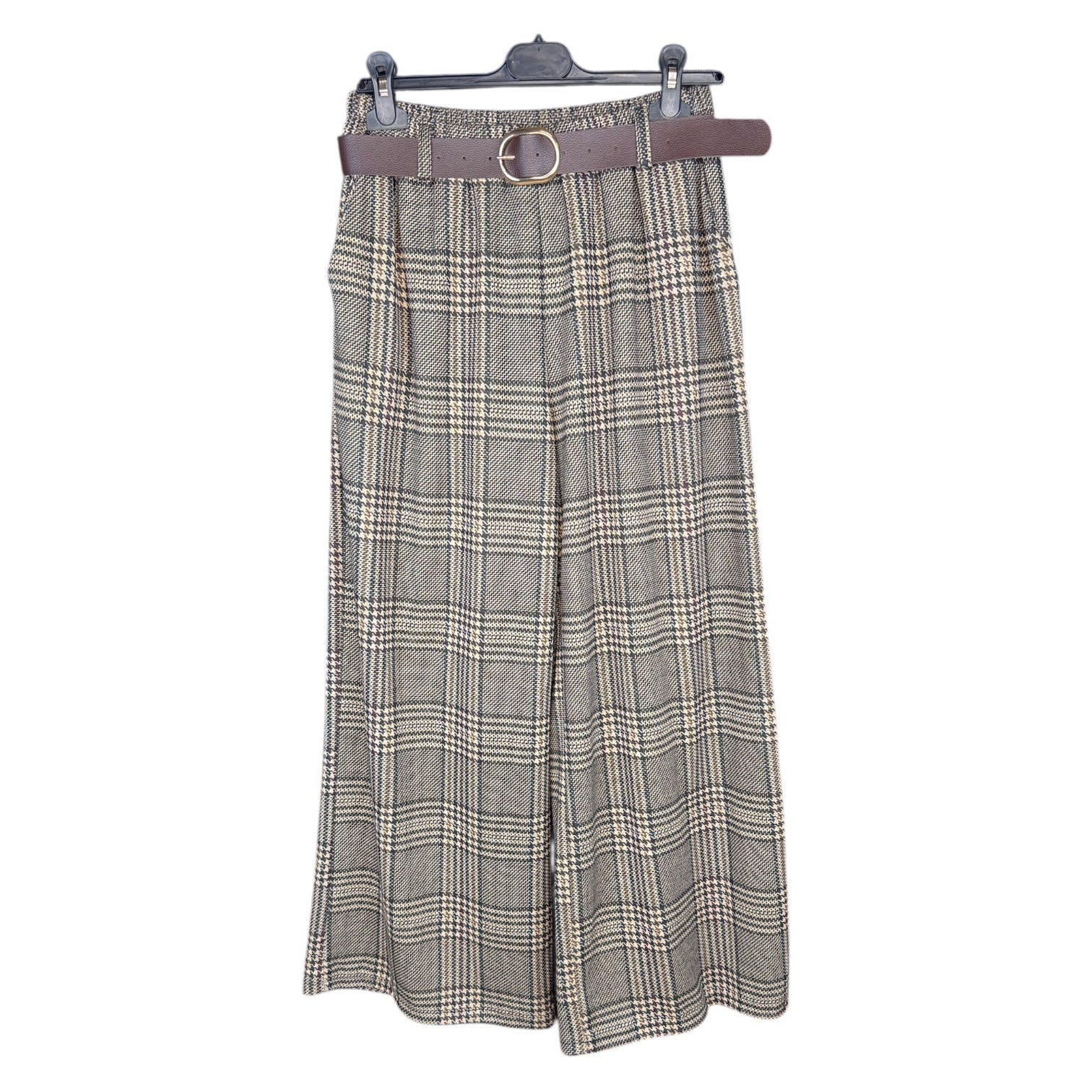 Con corte ancho y fluido, se adapta a tu figura sin marcar, ofreciendo movimiento y estilo en cada paso. Incluye un cinturón con hebilla dorada que realza la cintura y aporta el toque final al look.