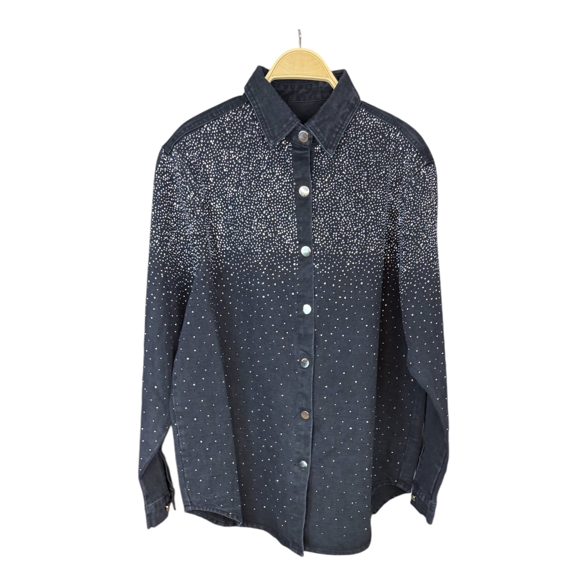 Sobrecamisa Brillo disponible en negro o tejano, con brillos degradados desde la parte superior hasta el bajo, creando un efecto difuminado muy favorecedor.