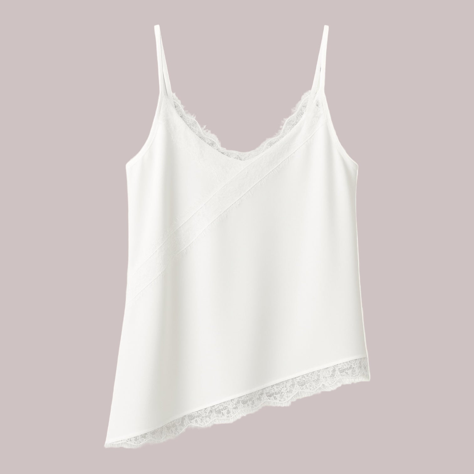 Este top lencero aporta un toque sofisticado y muy femenino gracias a su diseño asimétrico y al detalle de encaje delicado que recorre la prenda. Su tejido fluido lo hace ideal para looks de fiesta, combinándolo con blazer, falda o malla especial. ✨