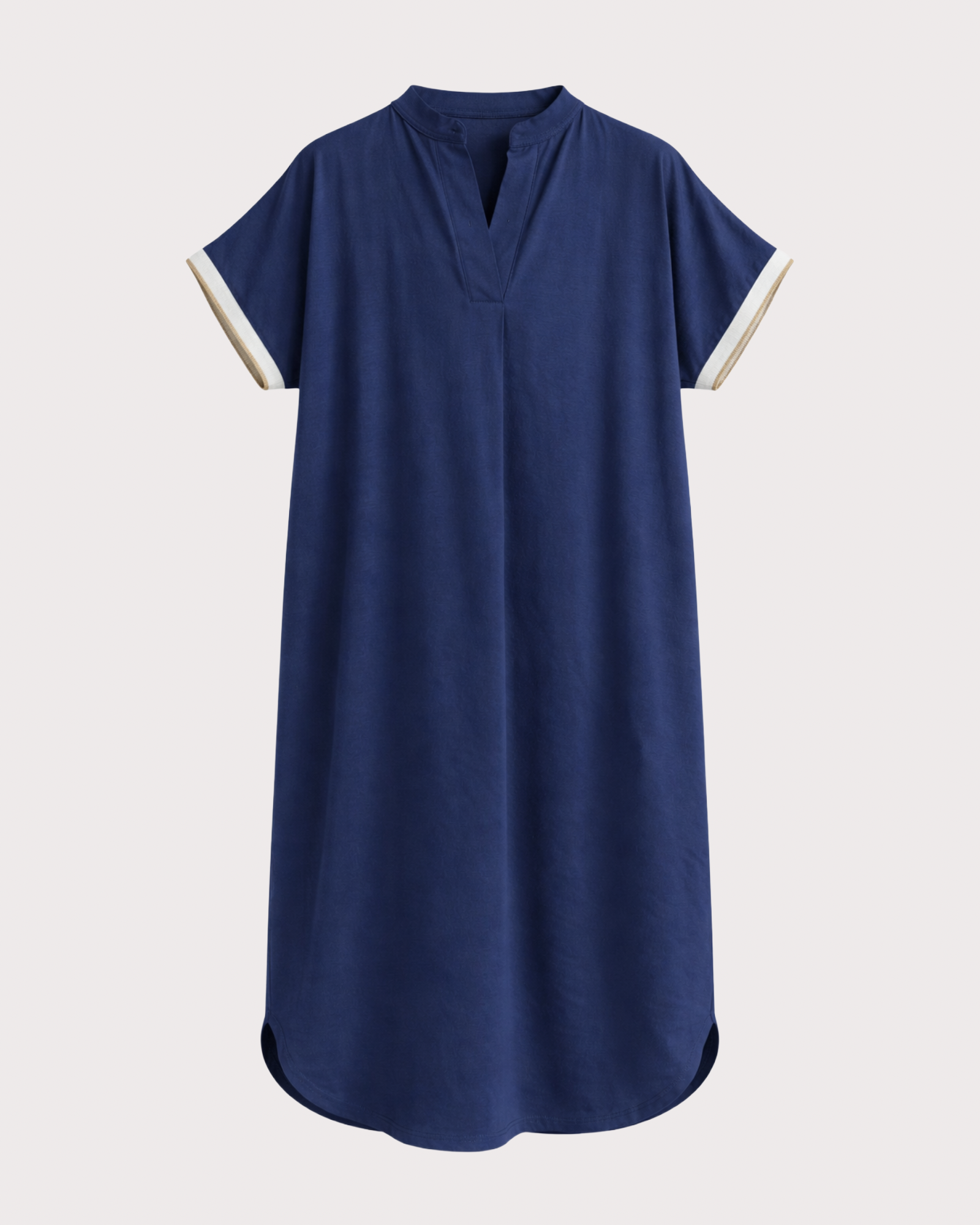 Vestido de corte recto, con cuello mao y manga corta con detalle en contraste. Diseño fluido y cómodo, ideal para looks versátiles y elegantes ✨