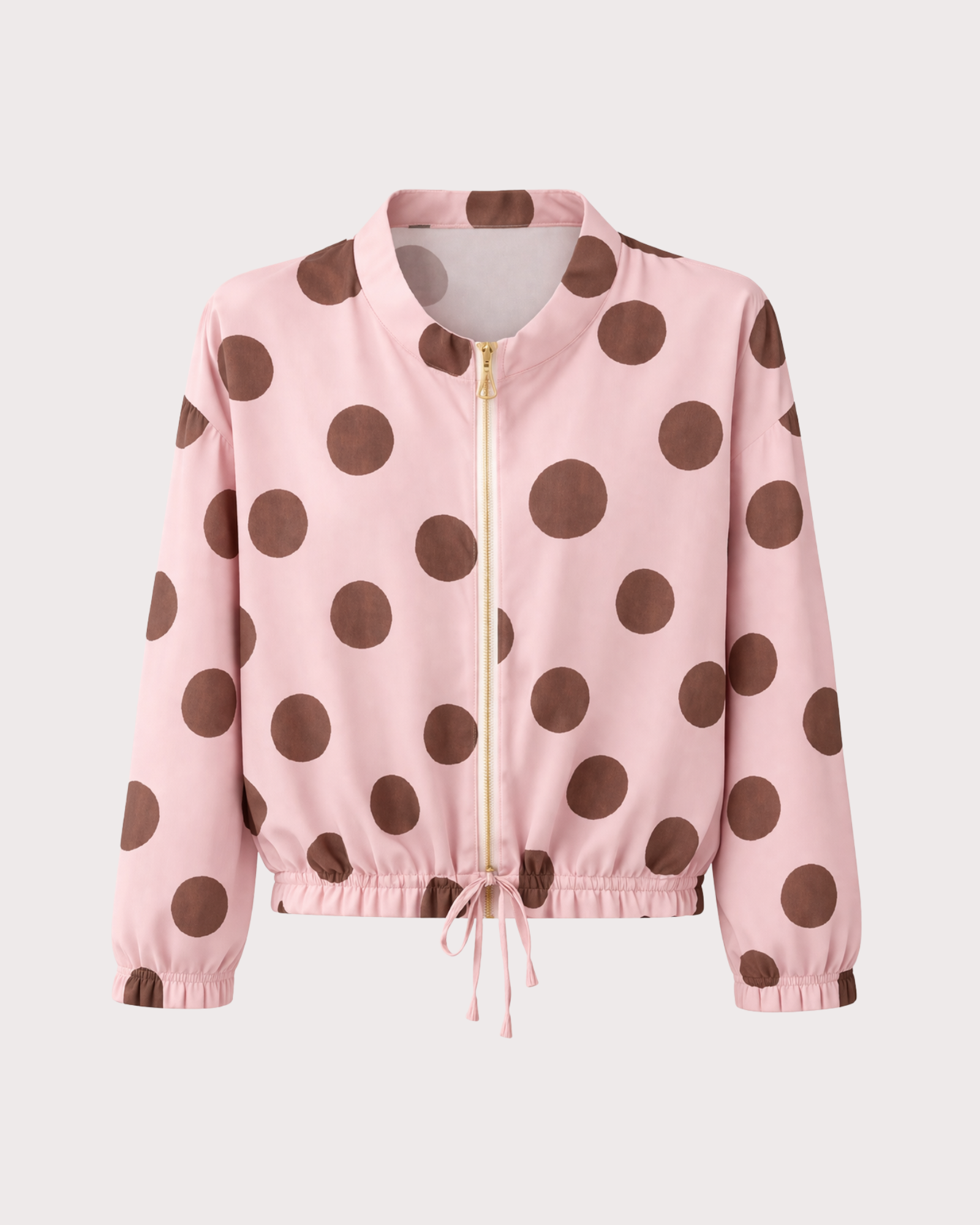 Chaqueta fluida y ligera de tejido semitransparente con estampado de lunares. Diseño moderno con cremallera frontal dorada, cintura ajustable y acabado elástico para un fit cómodo y elegante 🌿