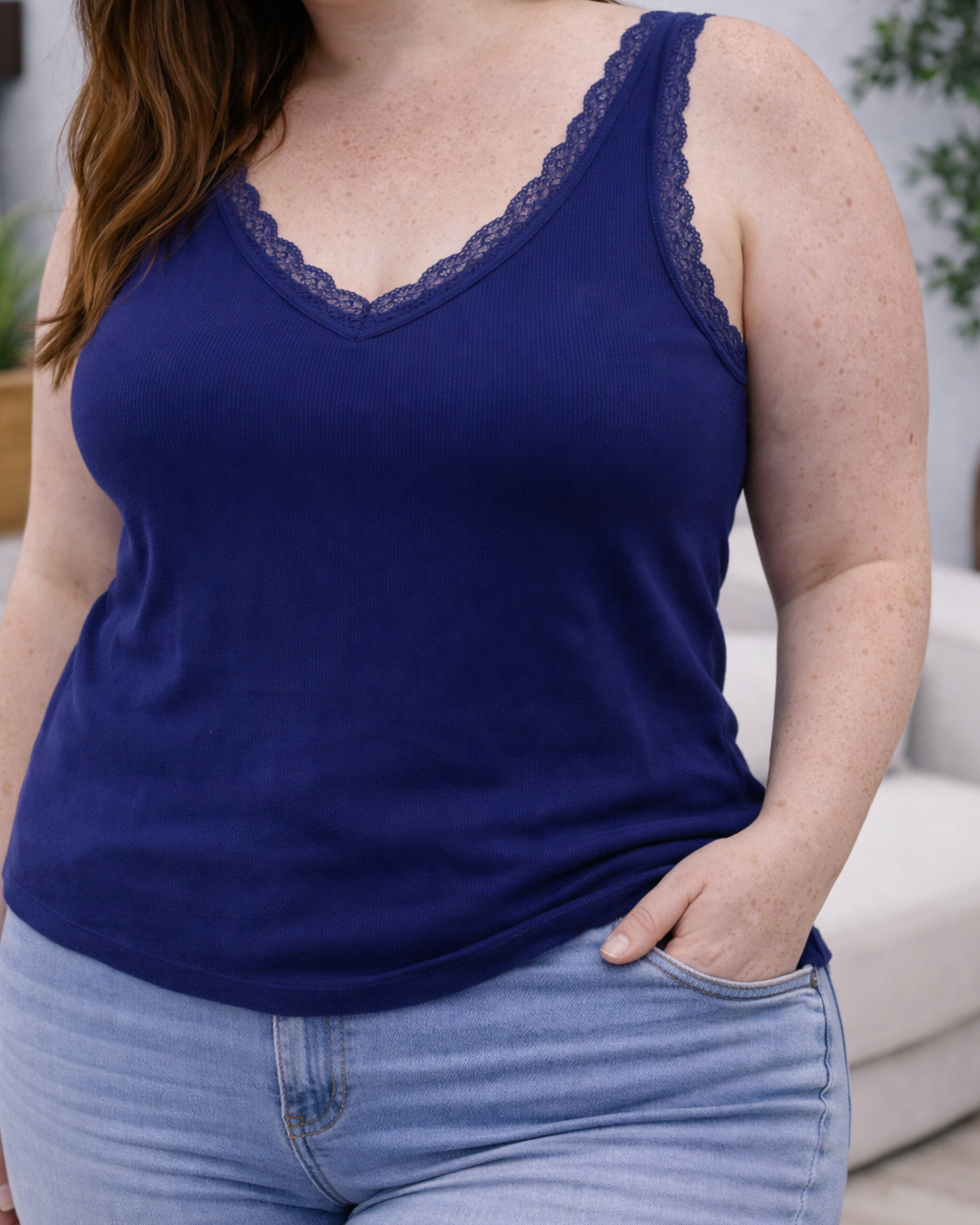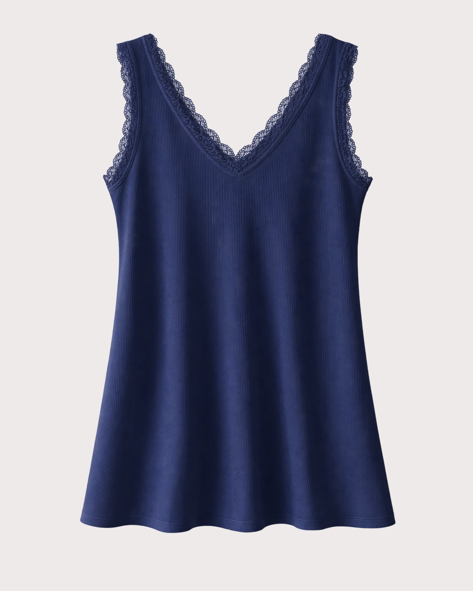 Tirante de canalé con diseño fluido y caída natural que aporta comodidad y estilo en el día a día. Detalle de escote en pico con delicada puntilla que realza la prenda con un toque femenino y elegante. ✨